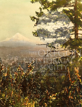 This is a hand-tinted postcard image of Mount Hood as seen from the top of Mount Tabor in East Portland in roughly 1900, and it's a picture from the Oregon Historical Society. Click on it, and it takes you to the OHS site, where you can look more closely at it and even buy a copy from OHS if you like. (Image links to www.ohs.org)