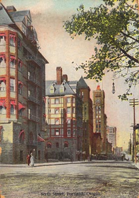 An afternoon scene on Sixth Street, deep in the "respectable" part of town. The closest building is the posh and comfortable Portland Hotel, and the clock tower behind is the Oregonian building. This image comes from a postcard which was postmarked 1906. (It also appears in Chapter 1.)